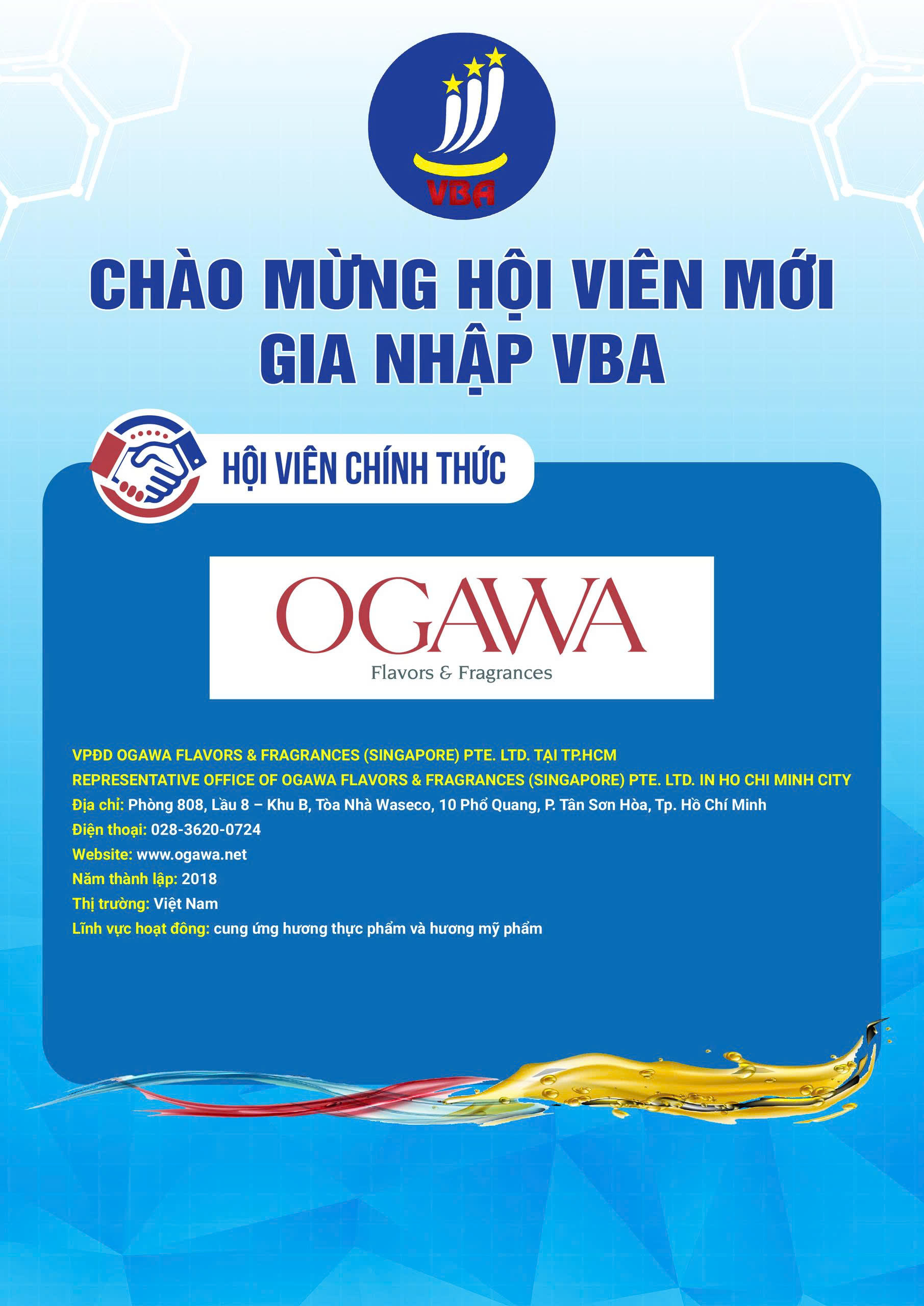 Hiệp hội Bia – Rượu – Nước giải khát Việt Nam (VBA) trân trọng chào mừng Văn phòng đại diện Ogawa Flavors & Fragrances (Singapore) Pte. Ltd. tại TP. Hồ Chí Minh (Representative Office of Ogawa Flavors & Fragrances (Singapore) Pte. Ltd. in Ho Chi Minh City) trở thành hội viên mới của Hiệp hội.
