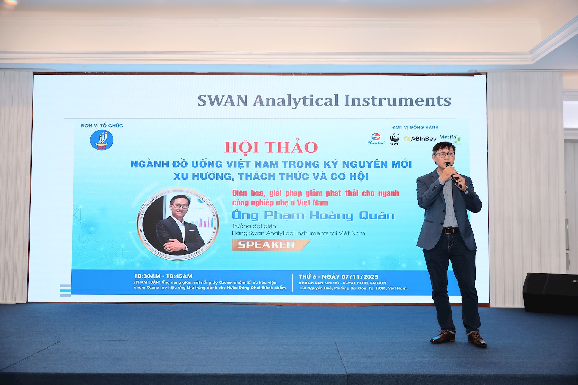 Ông Phạm Hoàng Quân – Trưởng đại diện Hãng Swan Analytical Instruments tại Việt Nam, trình bày tham luận với chủ đề: “Ứng dụng giám sát nồng độ Ozone (O₃), nhằm tối ưu hóa việc châm Ozone tạo hiệu ứng khử trùng dành cho dây chuyền sản xuất nước đóng chai.”. Trong ngành sản xuất đồ uống, việc kiểm soát chất lượng và đảm bảo an toàn vệ sinh trong từng công đoạn luôn đóng vai trò then chốt. Một trong những giải pháp tiên tiến đang được áp dụng hiện nay là ứng dụng công nghệ giám sát nồng độ Ozone (O₃) – yếu tố quan trọng giúp tối ưu hóa quá trình khử trùng trong dây chuyền sản xuất nước đóng chai, vừa nâng cao hiệu quả vận hành, vừa đảm bảo tiêu chuẩn an toàn thực phẩm và bảo vệ môi trường.