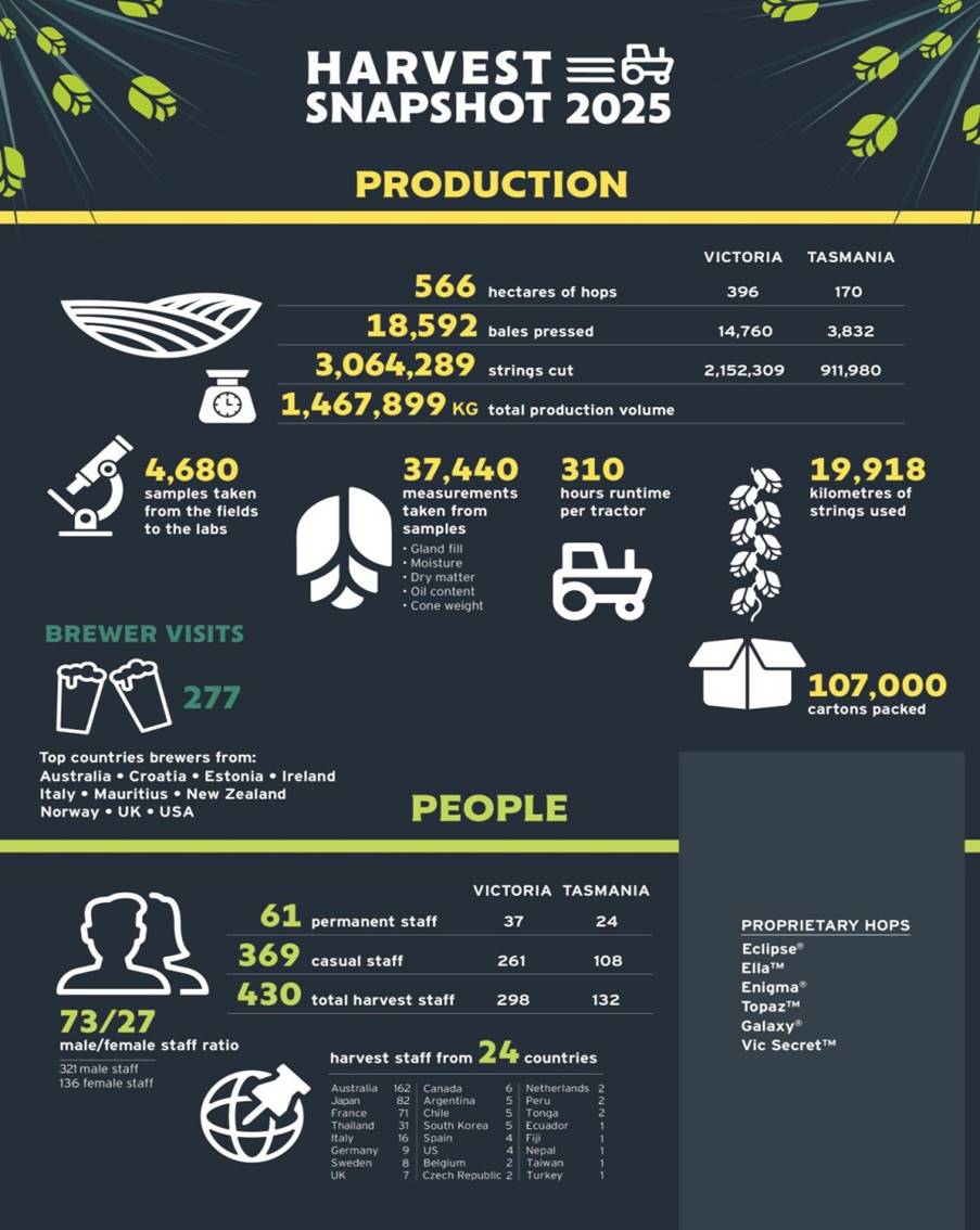 Sự trở lại của hiện tượng El Niño đã mang lại điều kiện thời tiết gần như lý tưởng - lần đầu tiên sau nhiều năm. Một mùa đông khô và lạnh tạo điều kiện lý tưởng cho giai đoạn ngủ đông của cây trồng, trong khi mùa hè nóng và ẩm lại thúc đẩy sự tăng trưởng nhanh chóng với cây hoa bia khỏe mạnh và mật độ ra hoa nhiều nhất trong ký ức gần đây. Tại nông trại ở bang Victoria nhiệt độ, bức xạ mặt trời và lượng mưa đều cao hơn mức trung bình. Trong khi đó, nông trại ở bang Tasmania ghi nhận nhiệt độ cao hơn mức trung bình, bức xạ mặt trời ở mức trung bình và lượng mưa thấp hơn trung bình, ngoại trừ hiện tượng ngập úng cục bộ vào đầu mùa xuân. May mắn thay, hầu hết các khu vực bị ảnh hưởng đã được tạm ngưng sản xuất trước đó nên không để lại tác động lâu dài đến vụ mùa.