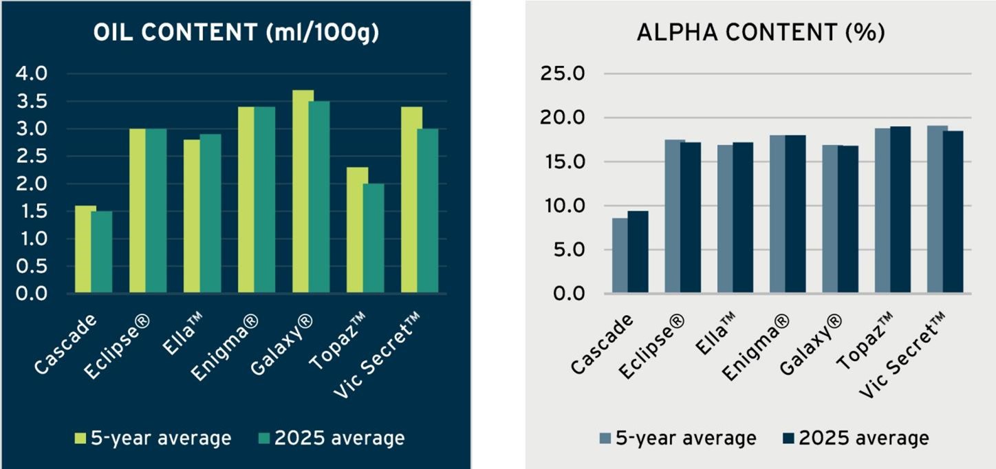 Về chất lượng nguyên liệu, tác động đến hương vị bia dự kiến sẽ vẫn mạnh mẽ, với hàm lượng dầu trung bình của năm nay chỉ thấp hơn hoặc bằng mức trung bình 5 năm đối với hầu hết các giống hoa bia độc quyền. Giống nổi bật nhất trong năm nay là Ella™, với hàm lượng dầu và alpha đều cao hơn mức trung bình 5 năm, hứa hẹn mang lại chiều sâu về hương vị và độ phức tạp khi kết hợp với các giống hoa bia hiện đại khác. Eclipse®, Galaxy® và Vic Secret™ đều ghi nhận mức giảm nhẹ về alpha và được kỳ vọng sẽ tạo ra những loại bia cân bằng với hương vị và mùi thơm đặc trưng.