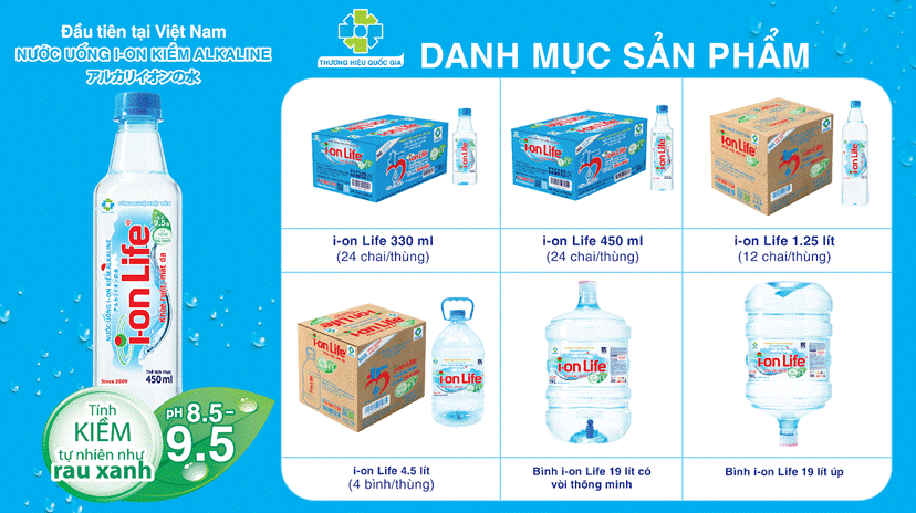 Với tính kiềm tự nhiên như rau xanh pH 8.5-9.5 (không bổ sung hóa chất để điện phân), giúp cân bằng acid dư thừa trong cơ thể. i-on Life còn giàu khoáng chất tự nhiên phong phú như: Na, Ca, K, Mg… Với hàm lượng khoáng ~180mg/l tồn tại dưới dạng ion nên cơ thể dễ dàng hấp thu.