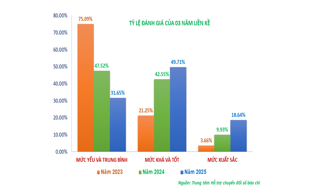 Tổng số cơ quan báo chí đạt mức độ trưởng thành chuyển đổi số báo chí năm 2025 đạt mức xuất sắc có 33 đơn vị, mức tốt có 57 đơn vị, mức khá có 31 đơn vị, mức trung bình có 9 đơn vị và mức yếu có 47 đơn vị.