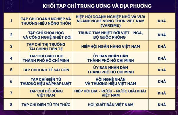Các cơ quan báo chí đạt mức Khá trong khối Tạp chí Trung ương và Địa phương gồm: Tạp chí Doanh nghiệp và Thương hiệu nông thôn; Tạp chí Khoa học và Công nghệ nhiệt đới; Tạp chí Thị trường tài chính tiền tệ; Tạp chí Giáo dục Thành phố Hồ Chí Minh; Tạp chí Kinh tế Sài Gòn; Tạp chí điện tử Thương hiệu và Pháp luật; Tạp chí Đồ Uống Việt Nam; Tạp chí điện tử Tri thức.